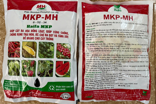 - MKP-MH bón cho tất cả các loại cây trồng giai đoạn sắp ra hoa, dưỡng trái non. Giúp cây ra hoa đồng loạt, cứng cuống, chống rụng trái non, nuôi và dưỡng trái, làm trái to, chắc hạt.