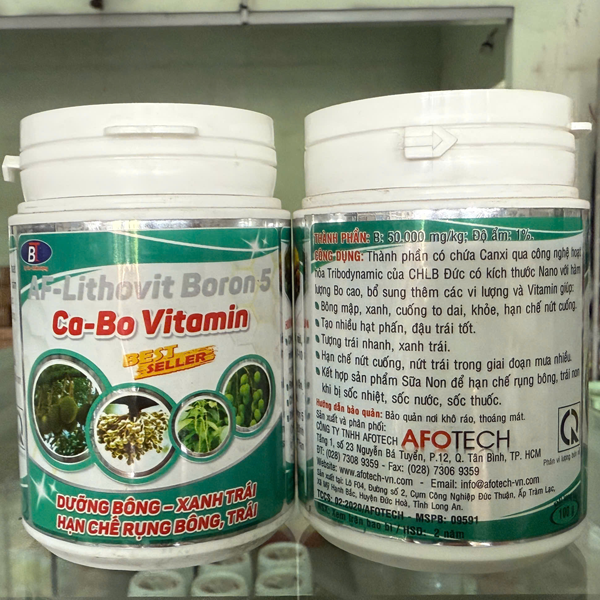 AFOTECH LITHOVIT CA-BO VITAMIN là sản phẩm phân bón lá thành phần có chứa Canxi qua công nghệ hoạt hóa Tribodynamic của CHLB Đức có kích thước Nano với hàm lượng Bo cao, bổ sung thêm các vi lượng và Vitamin giúp dưỡng bông, xanh trái, hạn chế rụng bông trái.