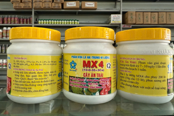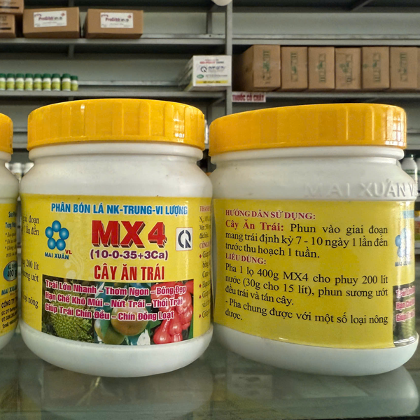 MAI XUÂN MX4 là sản phẩm phân bón lá NK-Trung-Vi lượng giúp trái lớn nhanh, thơm ngon, màu sắc bóng đẹp, bảo quản lâu. Đặc biệt giúp Cam - Quýt - Bưởi "Lên màu trái". Hạn chế nứt trái, thối trái do thiếu Canxi. Giúp cơm Sầu Riêng vàng sáng, ngon ngọt và ít bị sượng trái, trái chín đều và chín đồng loạt.
