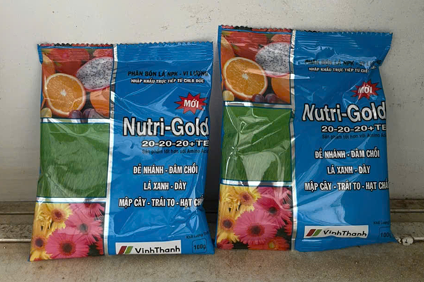 NUTRI-GOLD 20-20-20+TE là phân bón lá NPK-Vi lượng giúp đẻ nhánh - đâm chồi - lá xanh - dày - mập cây - trái to - hạt chắc. Phát triển cân đối rễ, thân, lá, cành, chắc hạt, trổ đều, mập cành, giúp cây sinh trưởng tốt.