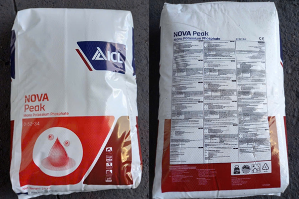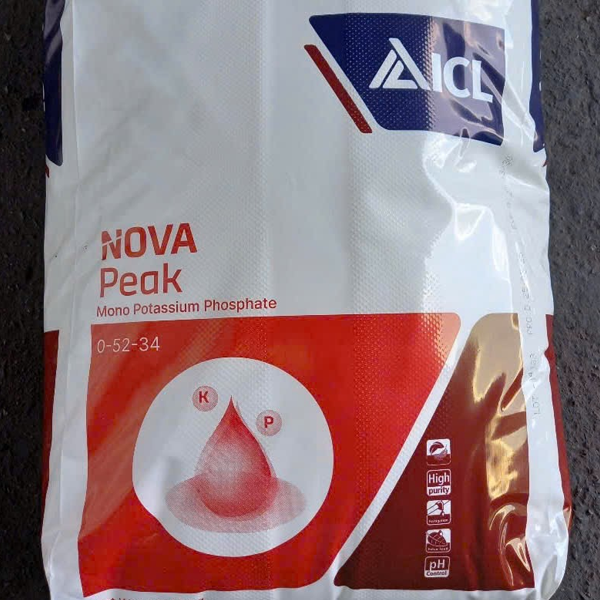 NOVA PEAK - MONO POTASSIUM PHOSPHATE (0-52-34) là sản phẩm phân bón cung cấp hàm lượng lân cao và kali giúp lá nhanh già, nhanh lụa, khắc phục hiện tượng ra đọt non trong điều kiện thời tiết mưa nhiều, chặn đọt. Sản phẩm giàu lân và kali tan thích hợp bón cho cây tại các giai đoạn khác nhau: ra rễ, ra hoa, đậu trái, trái chín và thu hoạch, các giai đoạn cần mức đạm thấp hơn.