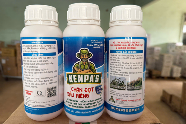 KENPA'S CHẶN ĐỌT SẦU RIÊNG là sản phẩm phân bón vi lượng giúp kiềm hãm sự phát triển của chồi, ngọn, khống chế đọt non, lá già nhanh, ngăn chặn cây ra đọt. Xử lý ra hoa sớm, nghịch vụ, giúp phân hóa mầm hoa, ra hoa đồng loạt, ủ mầm hoa cực nhanh.