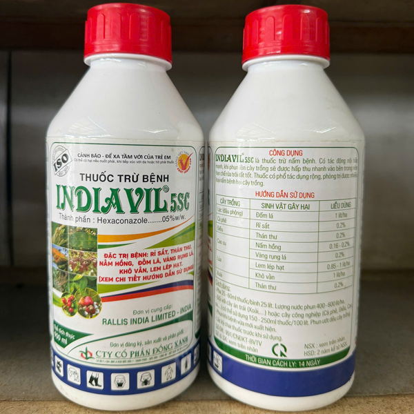 ĐỒNG XANH - INDIAVIL 5SC 900ML là sản phẩm thuốc trừ nấm bệnh có tác dụng nội hấp cực mạnh, khi phun lên cây trồng sẽ hấp thu nhanh vào bên trong nên hạn chế rửa trôi rất tốt. Thuốc có phổ tác dụng rộng, phòng trị được nhiều loại nấm bệnh hại cây trồng. Đặc trị bệnh rỉ sắt, thán thư, nấm hồng, đốm lá, vàng rụng lá, khô vằn, lem lép hạt.
