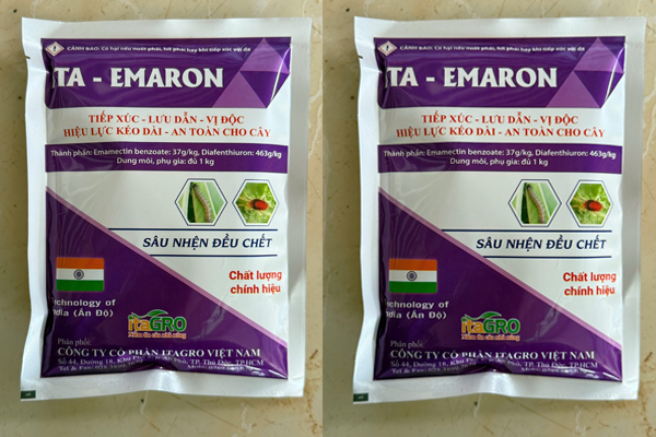 - Itagro - Emaron là sản phẩm với sự kết hợp của hai hoạt chất thuốc trừ sâu nhện tiên tiến vừa có tính tiếp xúc, thấm sâu và nội hấp (lưu dẫn) mạnh, hiệu quả kéo dài là Difenthiuron và Emamectin benzoate giúp quản lý hiệu quả sâu hại đã kháng thuốc.