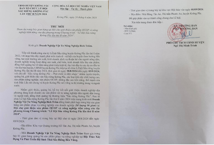 Ban tổ chức Lễ hội Sầu riêng Krông Pắc lần thứ II năm 2024 gửi lời mời Doanh nghiệp Vật tư Nông nghiệp Bích Trâm đồng hành phối hợp: